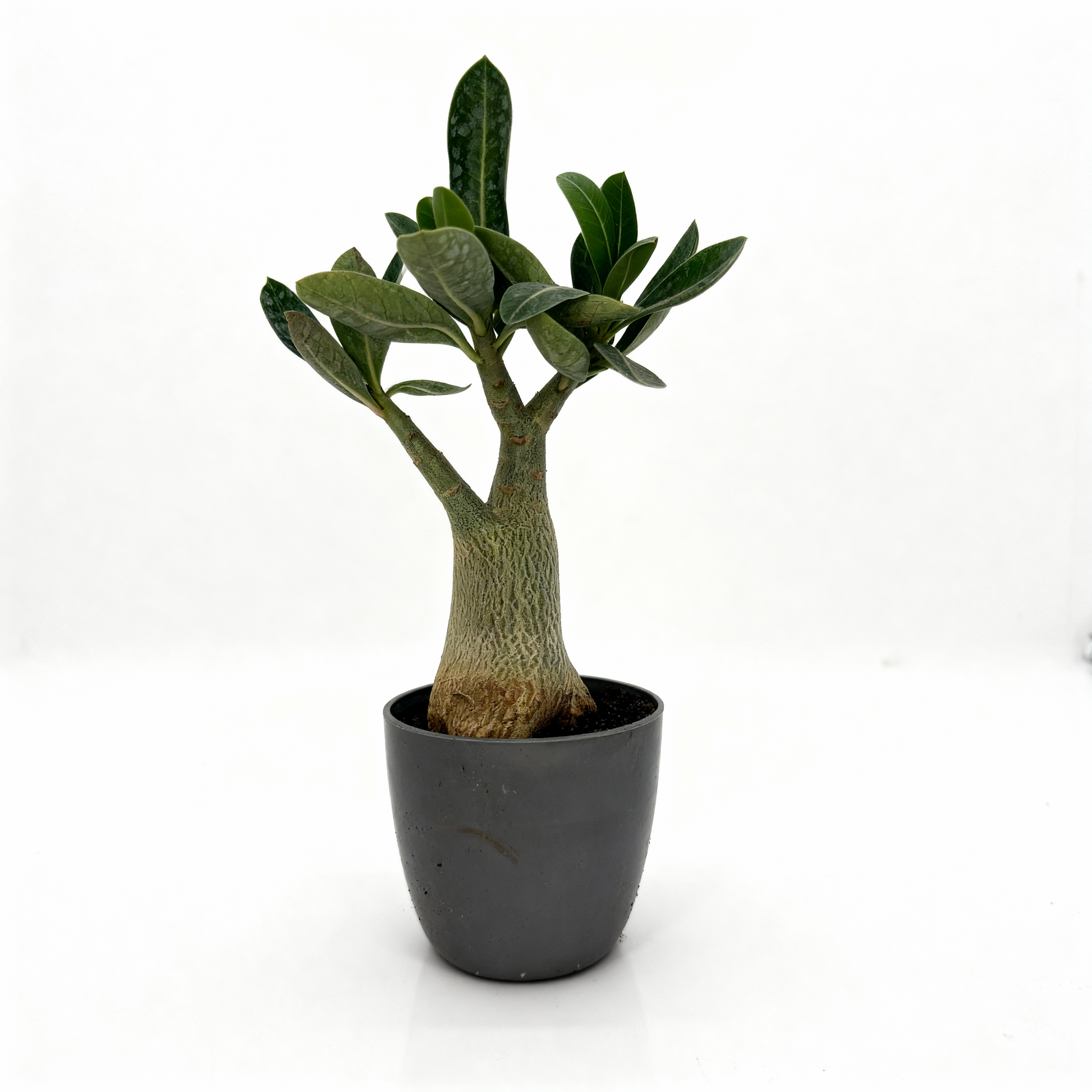 A stunning Adenium Desert Rose featuring a thick sculptural trunk and glossy green leaves.