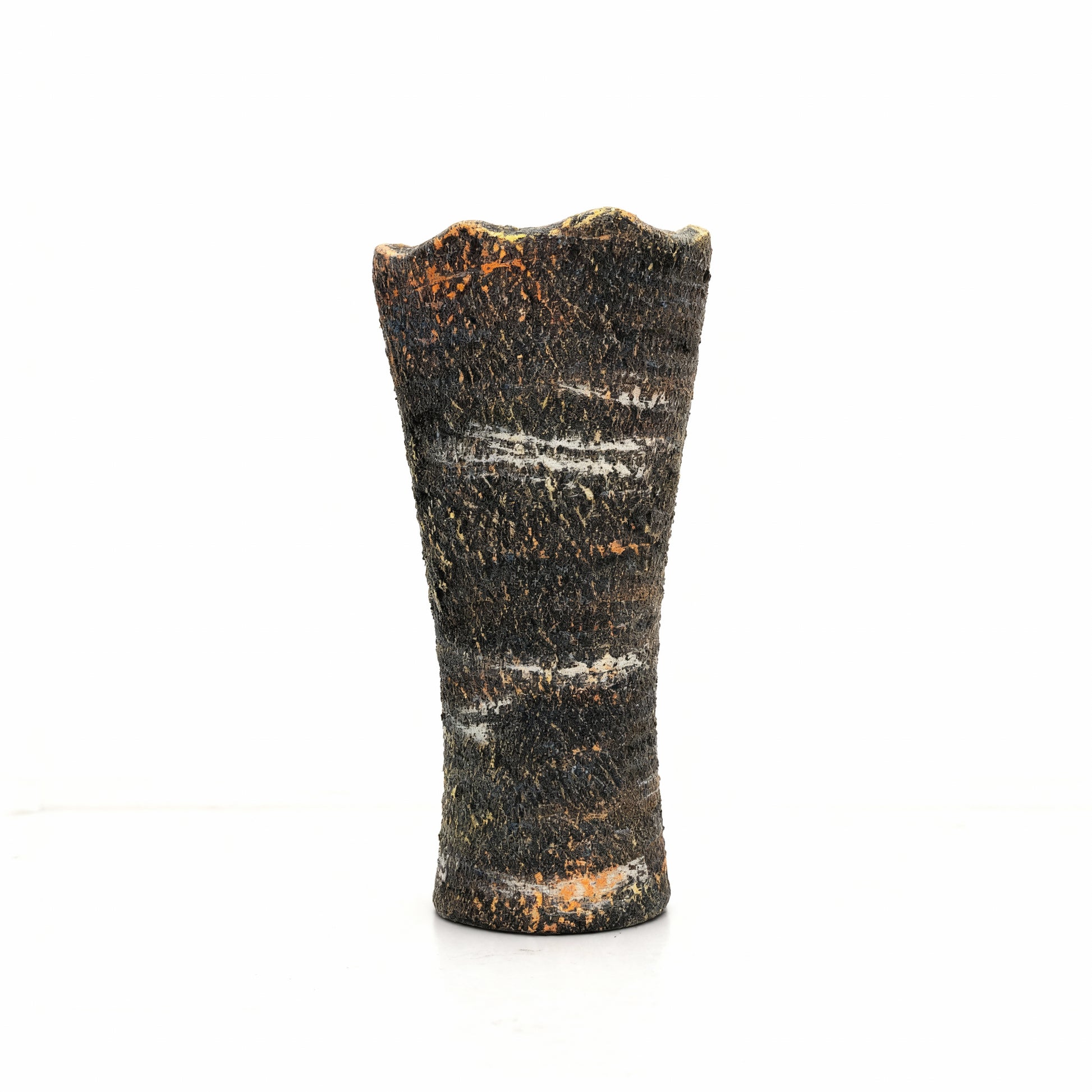 A unique handcrafted ceramic pot featuring a rustic textured finish with earthy tones.